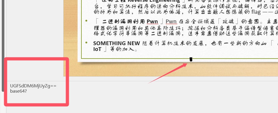 一部分是base64编码,另一部分是word文档(放大或者利用其他方式打开即可,里面的内容全部选中换个字体颜色就能发现隐藏的flag