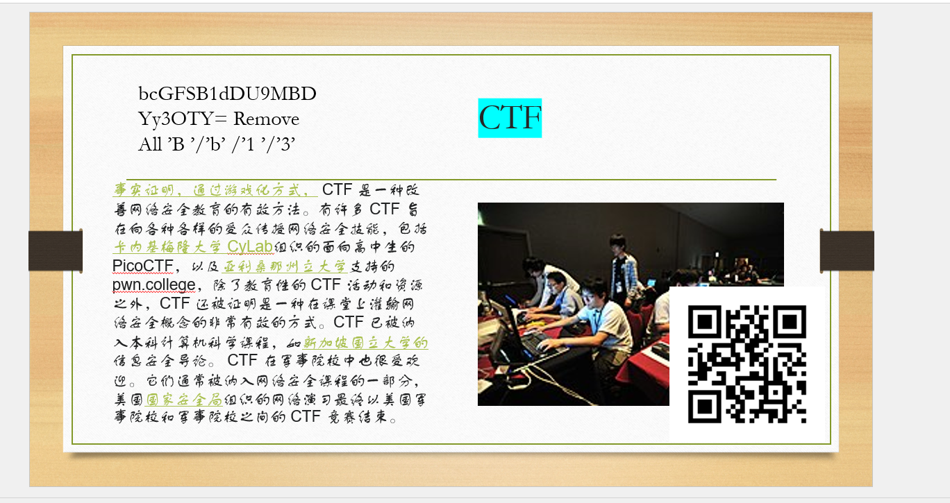 第五,六部分在第四页,第五部分移开CTF边框即可看到,根据规则移去字符解码即可